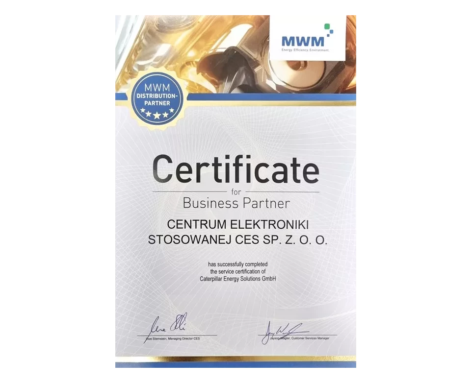 Od 2007 roku współpracujemy z firmą MWM, obecnie Caterpillar Energy Solutions GmbH. Otrzymany w 2022 roku Certyfikat, poświadcza, że jesteśmy partnerem i autoryzowanym dystrybutorem firmy Caterpillar Energy Solutions GmbH, a świadczone przez nas usługi osiągnęły najwyższy poziom kompetencji.