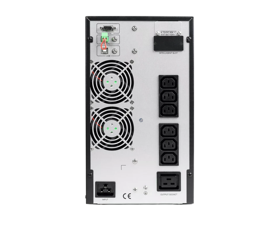 EPO - Emergency Power Off (wyłączanie awaryjne). Port EPO znajduje się na panelu tylnym UPS-a. W niektórych przypadkach awaryjnych, użytkownicy mogą natychmiast wyłączyć zasilanie odbiorów UPS-a poprzez aktywowanie portu EPO